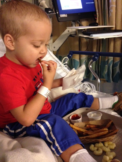 I may send a follow-up email this afternoon after I have some more information. Right now I’m waiting at Tristan’s bedside in Surgery Recovery for him to wake up. He had had his biopsy and lumbar puncture and is still knocked out. After last night, I wouldn’t be surprised if he sleeps a while. Earlier I held him while he went under, and then dashed down to the cafeteria to pick up his order: french fries; pirate booty; and ranch dressing. I have them here for him to eat as soon as he’s awake and begins demanding sustenance. In a couple of hours, we’ll meet with Dr. Kumar. I have many questions to ask her about Tristan’s medications over the next week (possibly no steroids!!!!!!) and our plans to head home tomorrow. Will update!