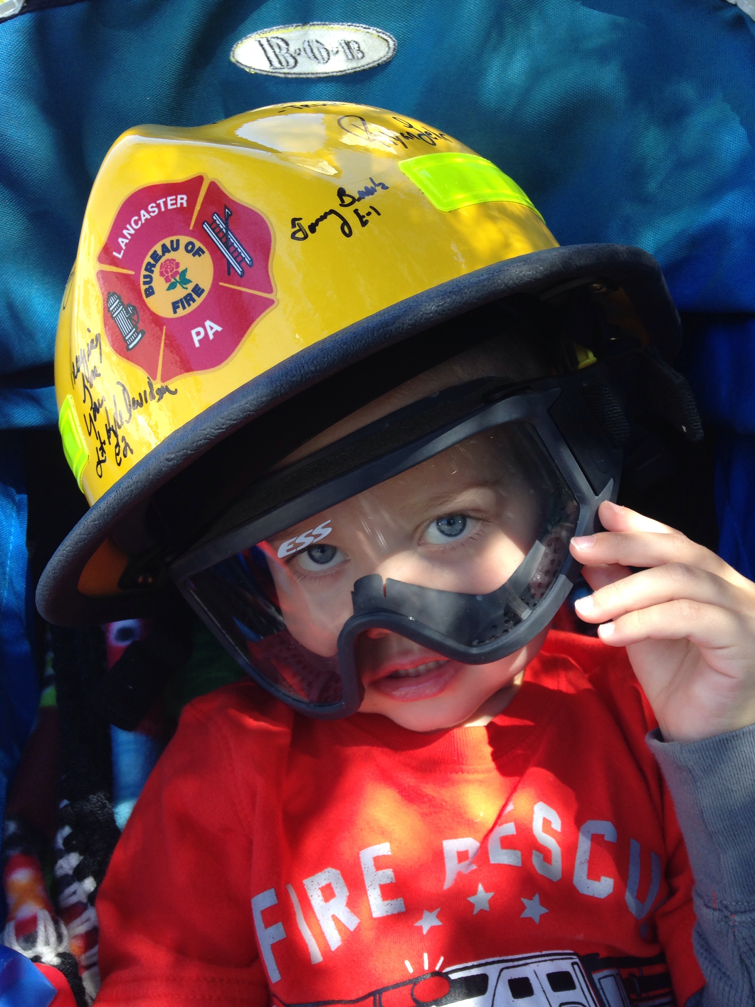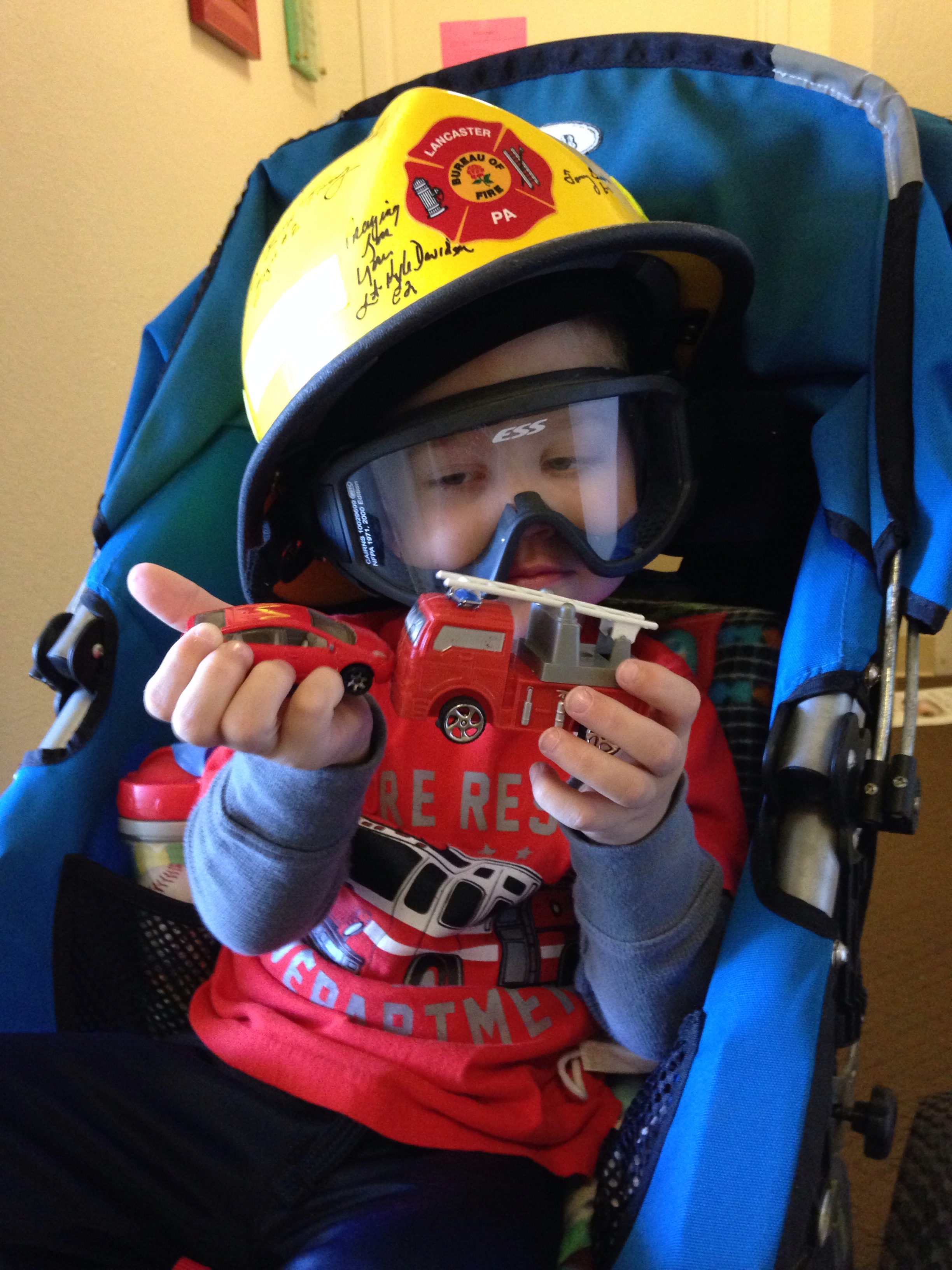 He was an amazing trooper today, despite the no food/no drink order since last night. He was in a good mood, and funny, and upbeat. We watched movies in bed after we woke up this morning — I was happy for the distraction and the means to kill time without seeing food or smelling food or thinking about food. Then we went for a run. Then Tristan played in the playroom while I showered, changed, and packed up for the hospital. He put on his new (real) fire helmet, this one supplied by the Lancaster PA fire department. It’s so heavy, it makes his head fall over to one side, but he said he was thankful for the goggles when we went outside into the hot sun. “Mom, they keep the sun out of my eyes and keep fire out of the firemen’s eyes when they fight fires!”