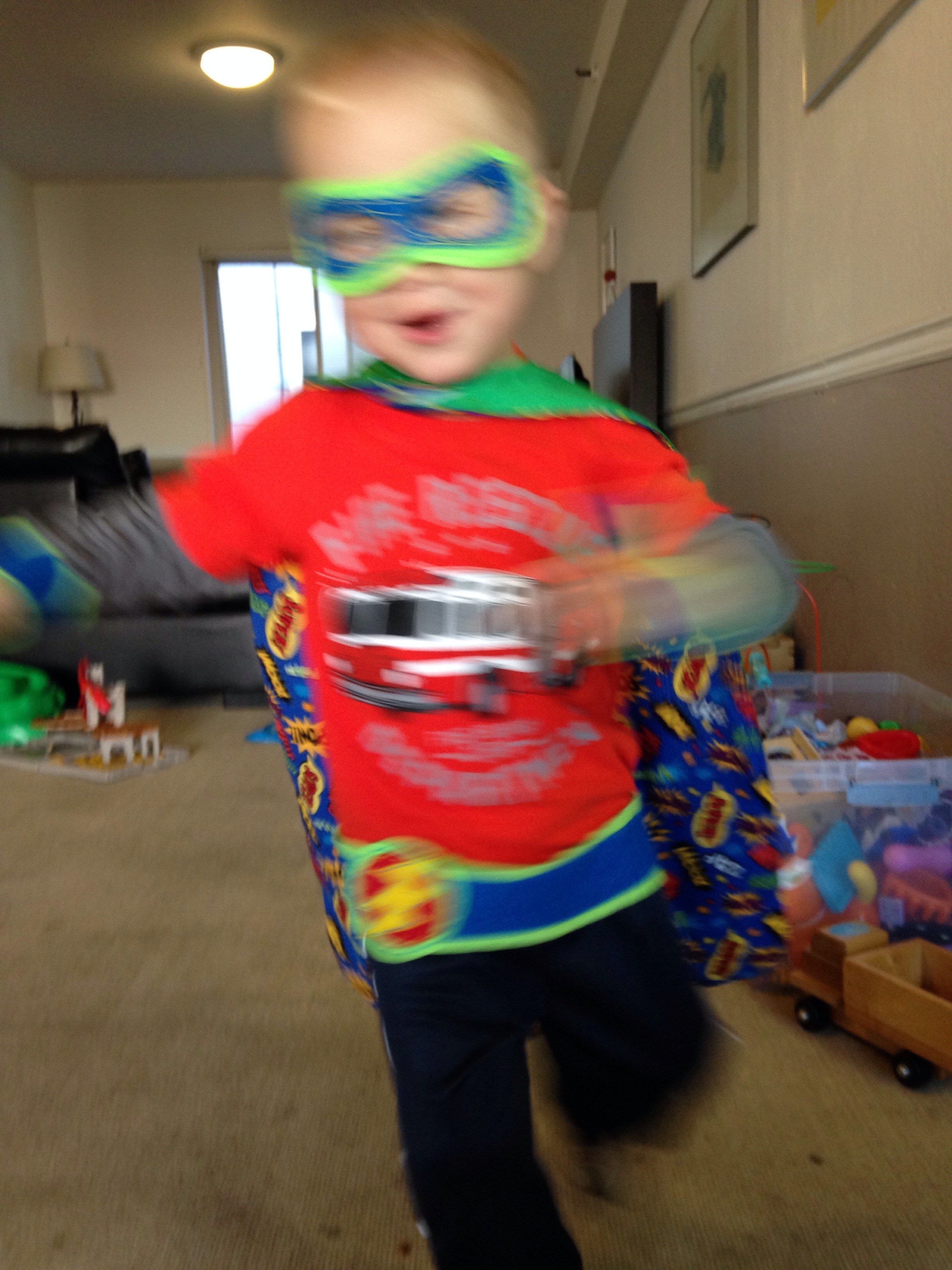 Now we’re back at Family House and Tristan is tucking into a slice of pepperoni pizza and a bag of pirate booty. He’s feeling good. A moment ago he was flying around the playroom in his superhero costume (with mask). Just 15 minutes after he opened his eyes in the OR recovery room, and the nurse gave us the usual bit about keeping him quiet for the rest of the day, and how he’s likely be exhausted, and how I should be careful not letting him do anything that requires coordination…just 15 minutes after all that, he insisted on walking out of recovery on his own feet to get a chocolate chip cookie at the cafe on the ground floor. We were discharged, headed for the cafe, and ran into the attending doctor who had just overseen Tristan’s procedure. The man was stunned. Absolutely floored. “I have to say,” he said, “I’m impressed.” None of us would have been walking like Tristan the Two Year-Old just 15 minutes after waking from general anesthesia, not to mention the lumbar puncture. I explained that his post-procedure tantrum about not having a cookie at the bedside produced a significant pulse of adrenaline that washed the remaining anesthetic from Tristan’s system. The doctor nodded in agreement. “I see,” he said.