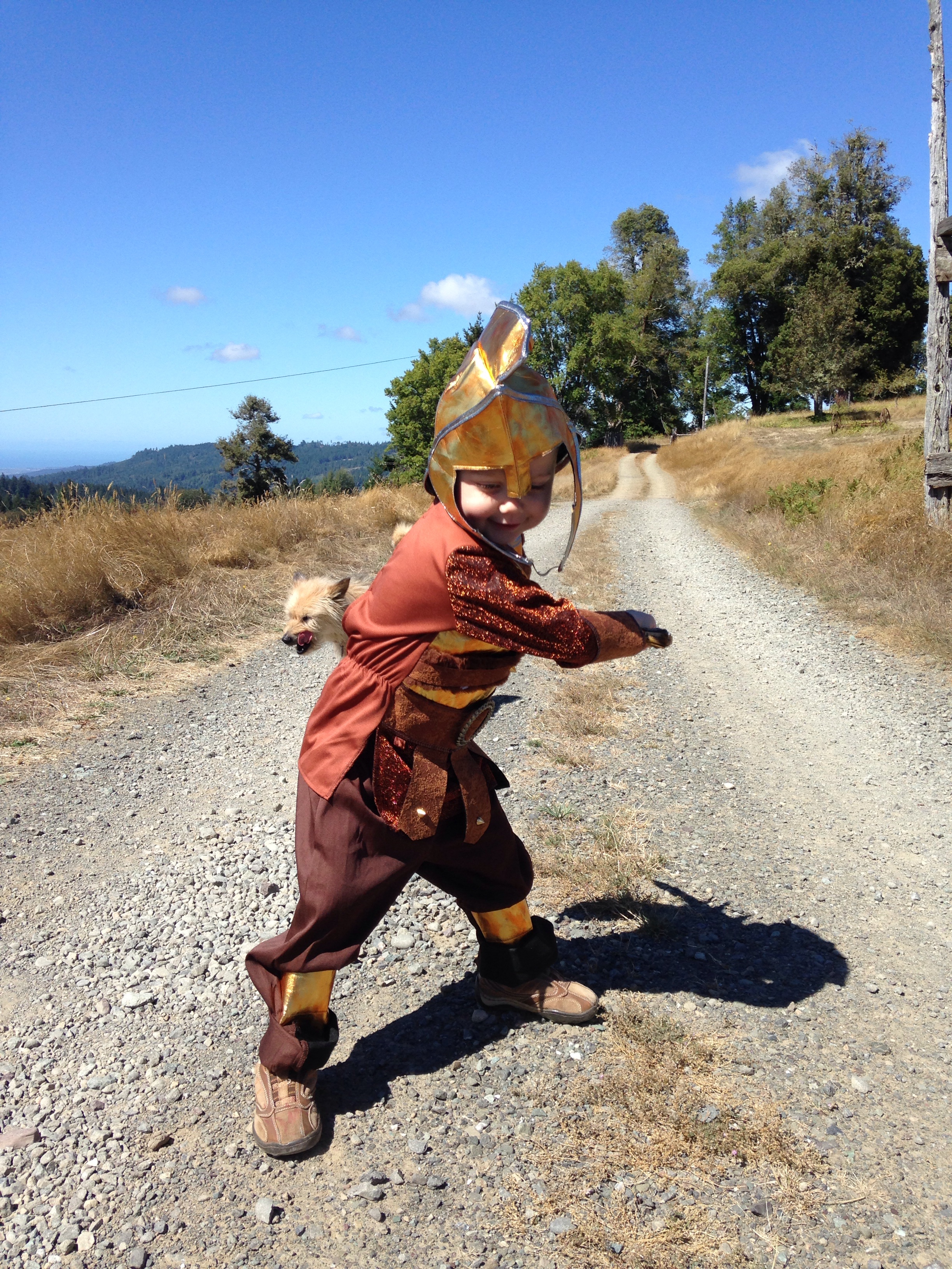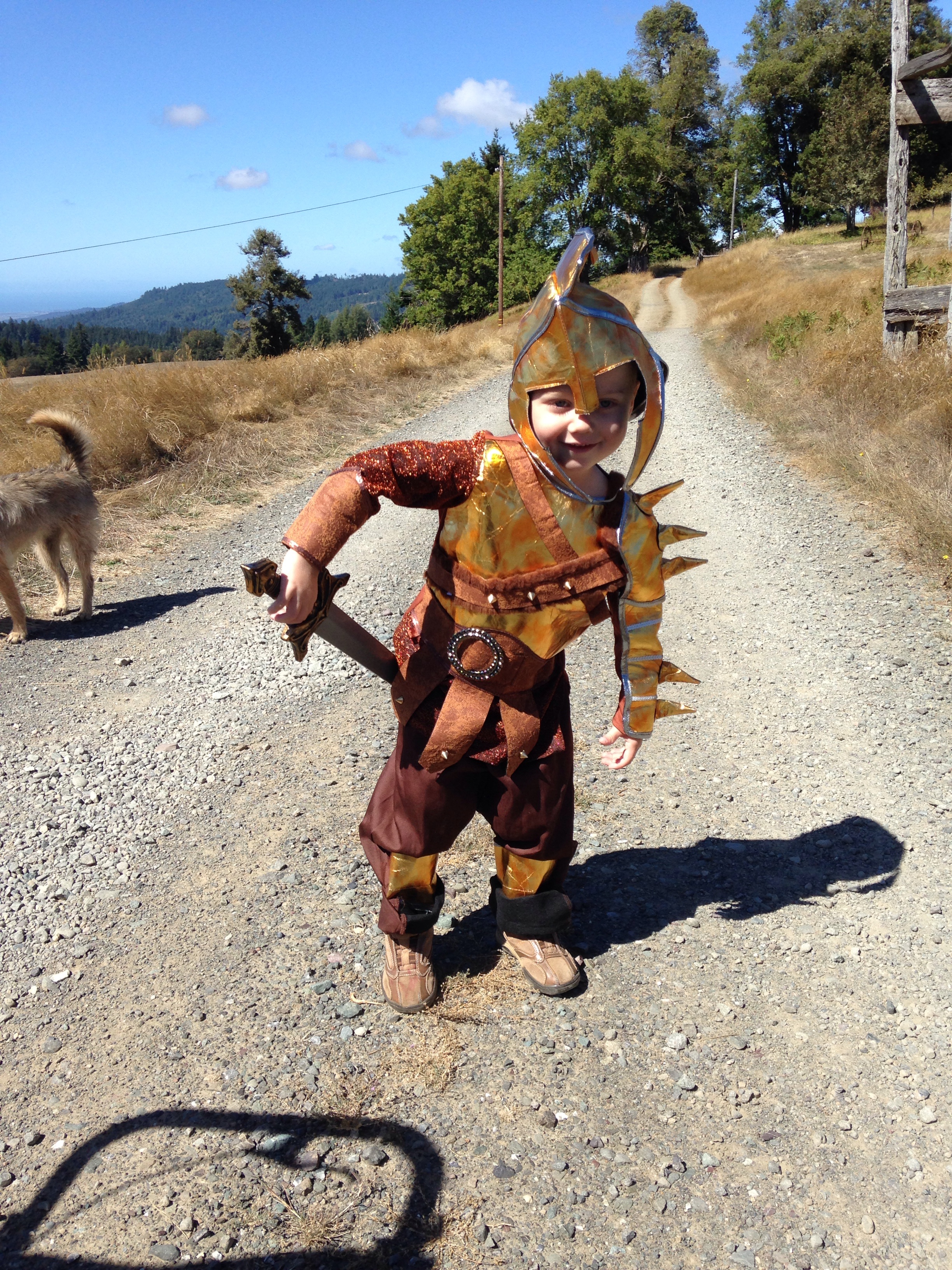 It’s been good to be home. Tristan is having a ball with his siblings. Each afternoon, Wednesday-Thursday-Friday, we walked up our ¼-mile long drive with the stroller and the dogs to meet the school bus. On Friday, Tristan walked the whole driveway on his own two feet, there and back, dressed as a Mongolian warrior. He was terrific.